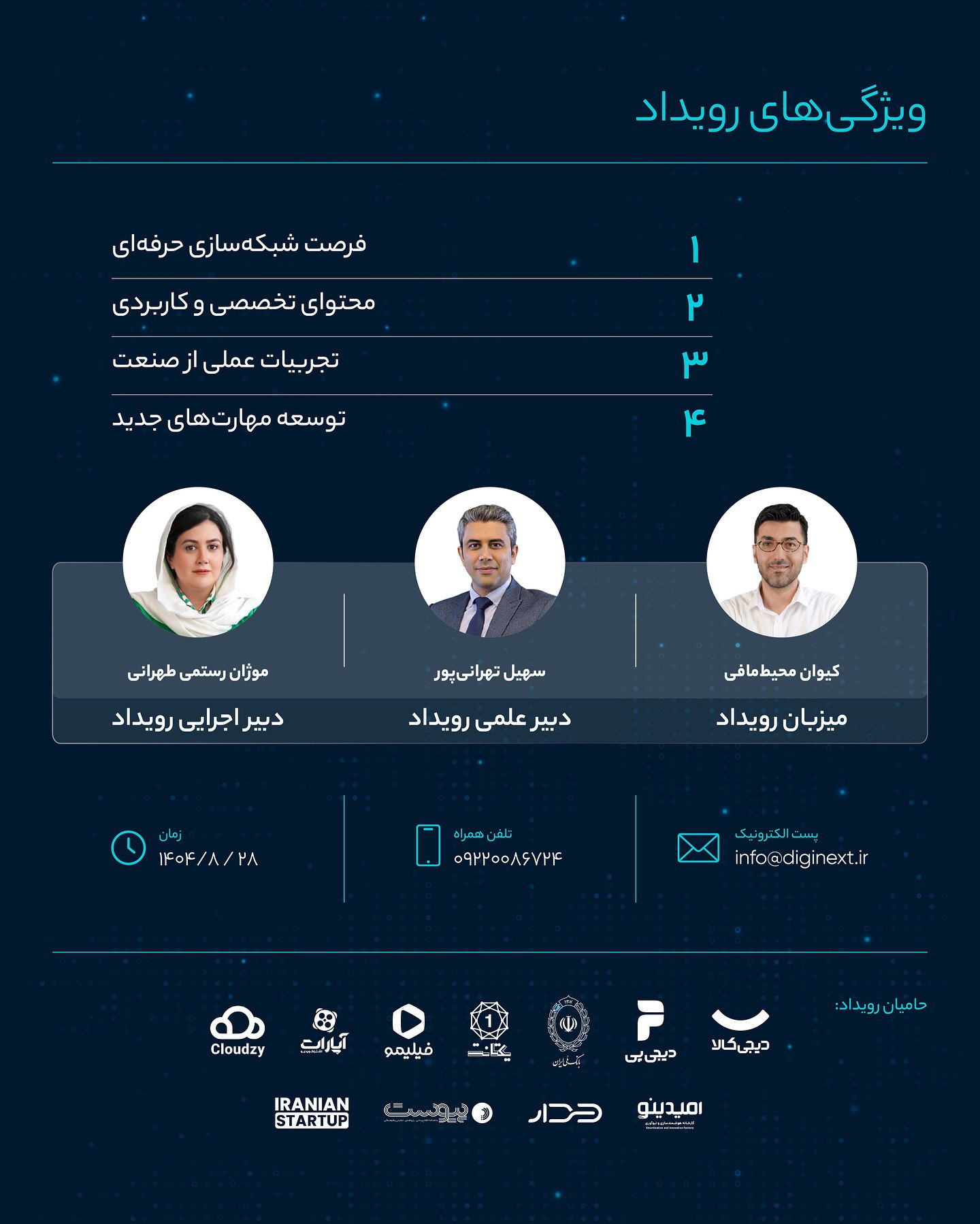این برنامه در ۲۸ آبان ۱۴۰۴ برگزار میشود. علاقهمندان میتوانند برای دریافت اطلاعات بیشتر با شماره ۰۹۲۲۰۵۶۷۲۴۲ تماس بگیرند یا به ایمیل info@diginext.ir پیام ارسال کنند. مجموعهای از شرکتها و سازمانهای معتبر حوزه فناوری نیز از این رویداد حمایت میکنند.